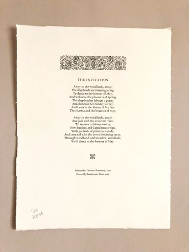 This poem has been set and cast in-house in 11pt Monotype Dante and letterpress-printed on 160gsm Velin Arches mould-made paper. 330 x 250mm.